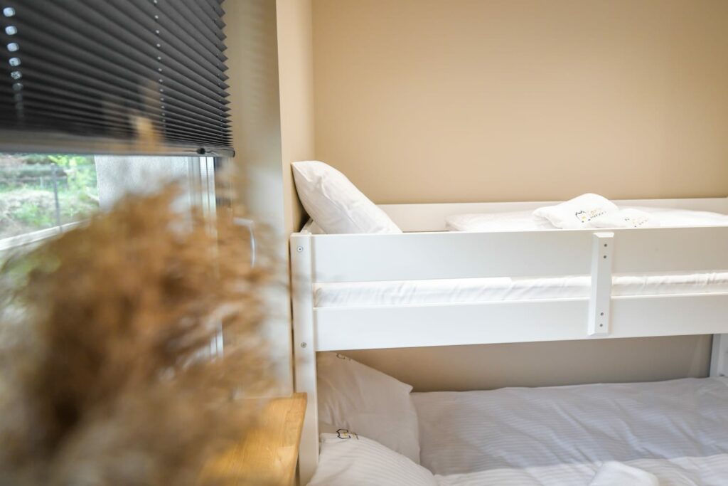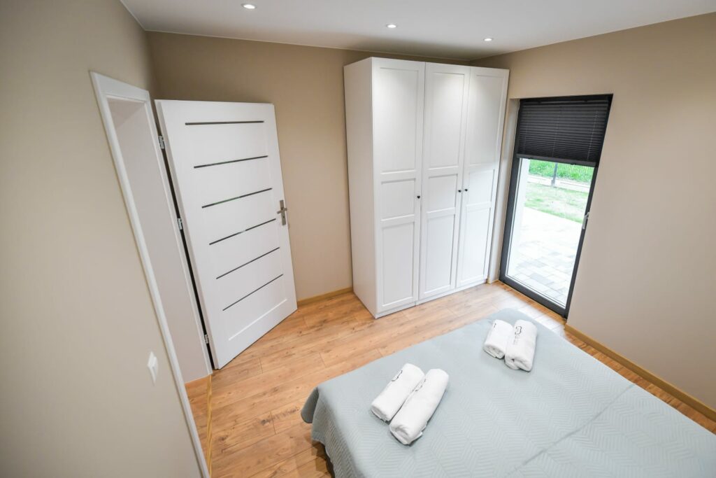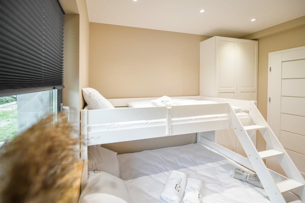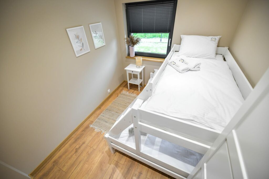 - Dwie oddzielne sypialnie: Zapewniające prywatność i spokój.Do dyspozycji gości są łóżka piętrowe, co czyni obiekt szczególnie przyjaznym dla rodzin.