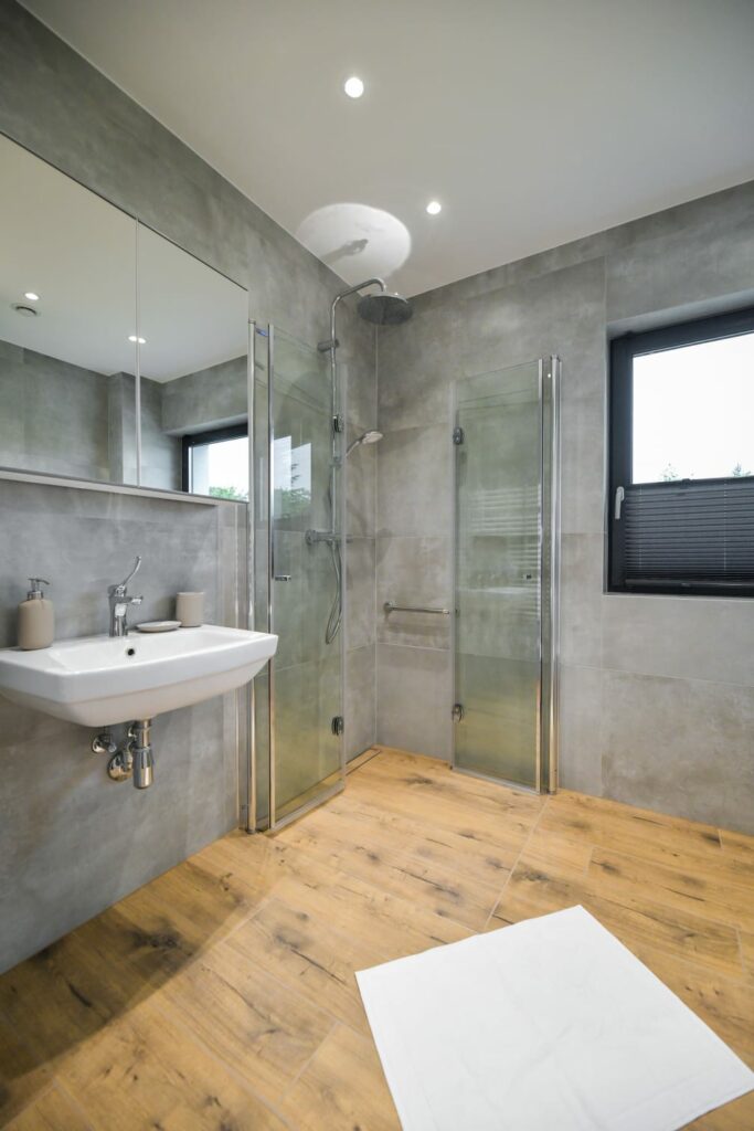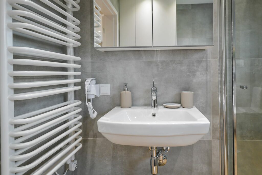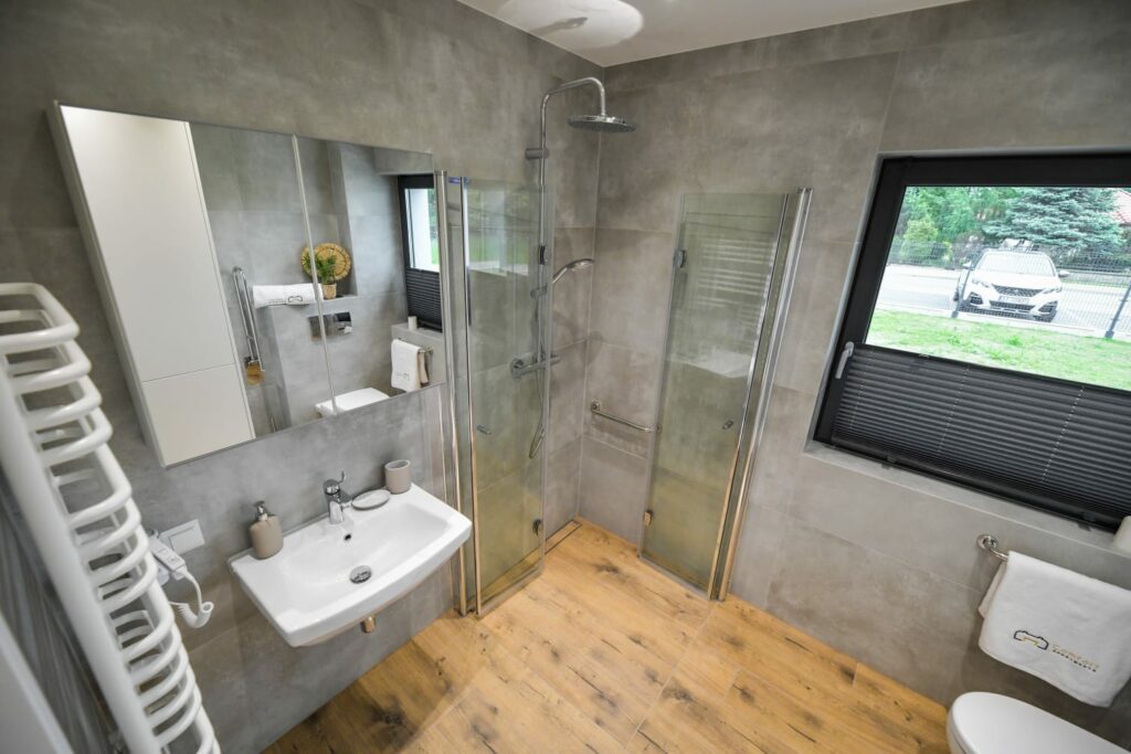 - Łazienka: Wyposażona w prysznic oraz pralkę (zapewniamy ręczniki i zestaw kosmetyków).
